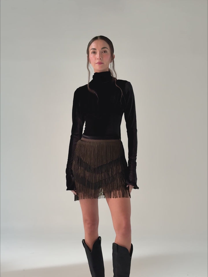 The Alas Skirt fuses strength and motion with layered fringes in deep brown and black, arranged diagonally to resemble wings in flight. Its fitted silhouette hugs the body, while the dynamic texture adds rhythm to every step. Ideal for night events, elegant dinners, or a bold statement look. Handmade in Colombia.