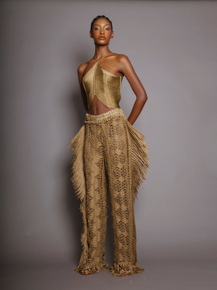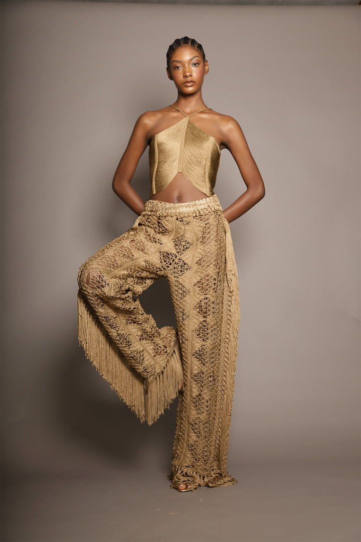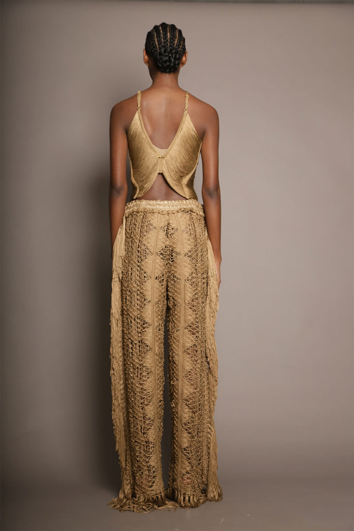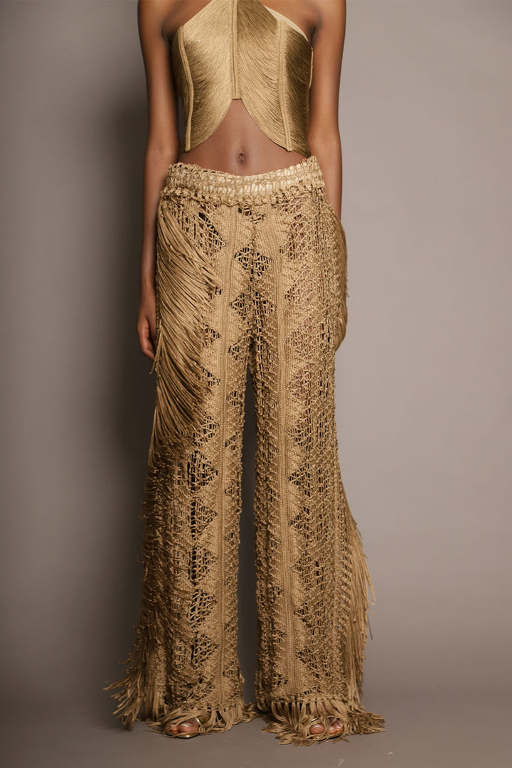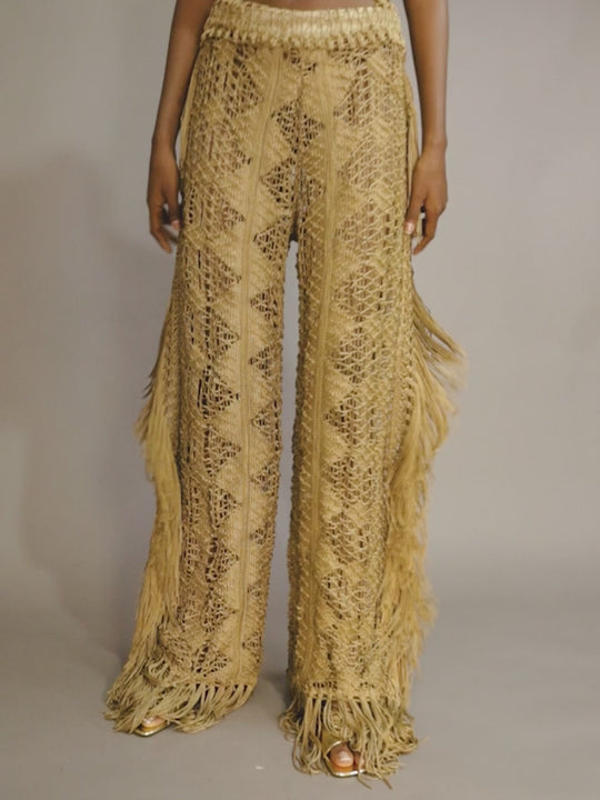 These wide-leg pants are a celebration of craftsmanship and movement. Handwoven with intricate openwork patterns and adorned with long fringe panels on each side, they embody a refined bohemian spirit. The natural tone enhances their organic allure, while the texture and volume add dimension and elegance to every step. A standout piece that effortlessly fuses artisanal tradition with contemporary sophistication