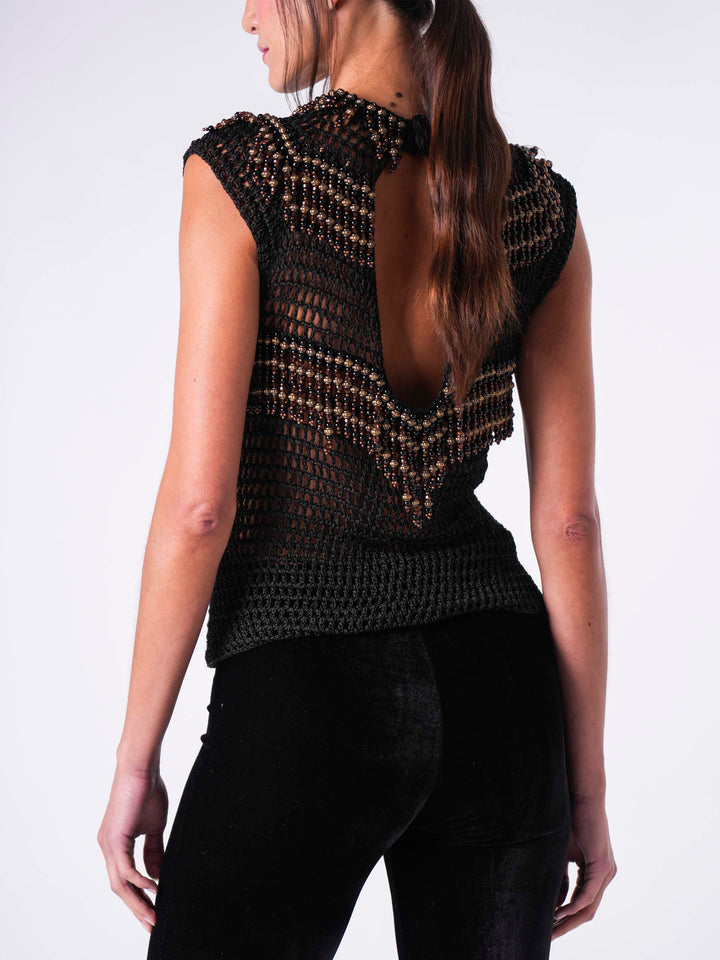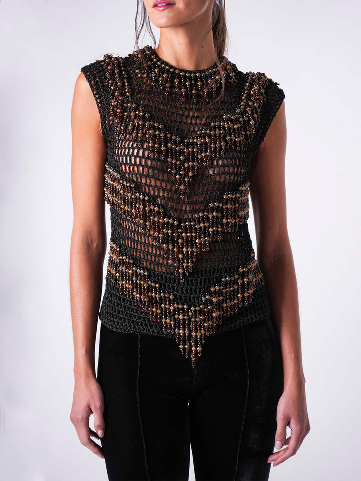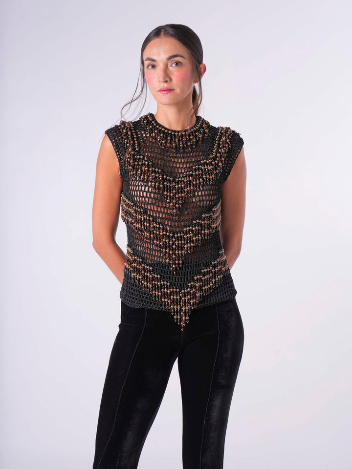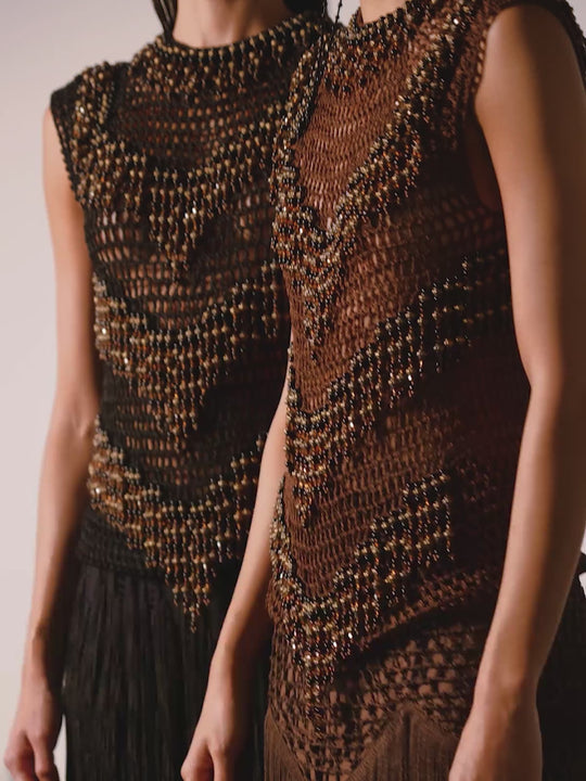 the Amaranto Top celebrates the mastery of Colombian craftsmanship. Its crocheted structure embraces the silhouette, adorned with intricate hand-beaded embroidery in bronze and golden tones that cascade like liquid light. Featuring a high neckline and subtly open back, it’s perfect for intimate dinners, special nights, or elegant cultural affairs. Every bead is a tribute to the spirit of artisanal luxury.