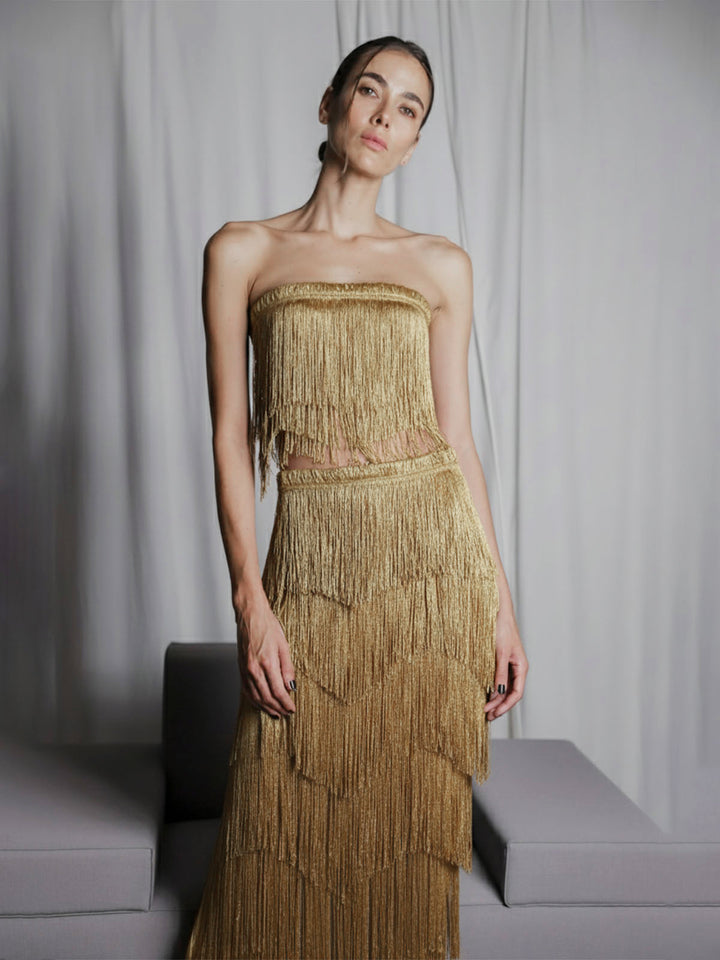 Long chocolate brown fringe skirt crafted in cascading layers that sway gracefully with every step. The fitted silhouette gently hugs the body, while sheer details bring a touch of refined sensuality. This piece embodies artisanal freedom and elevated craftsmanship designed for women who crave movement, elegance, and uniqueness in a single garment.