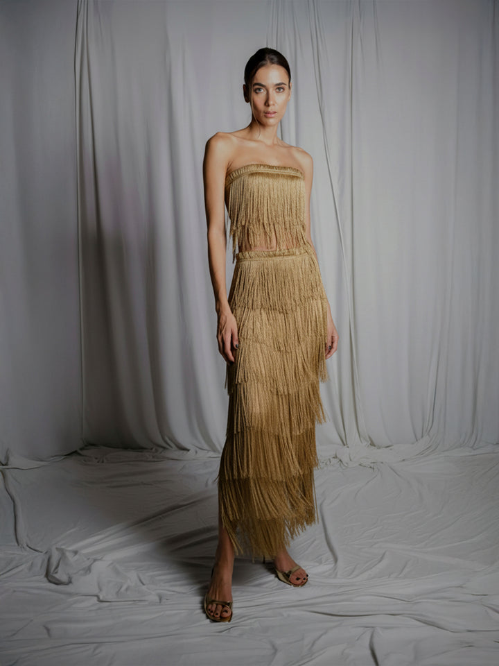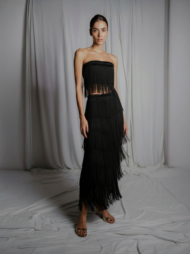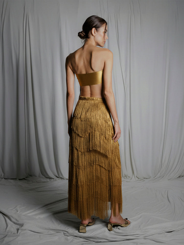 Long chocolate brown fringe skirt crafted in cascading layers that sway gracefully with every step. The fitted silhouette gently hugs the body, while sheer details bring a touch of refined sensuality. This piece embodies artisanal freedom and elevated craftsmanship designed for women who crave movement, elegance, and uniqueness in a single garment.