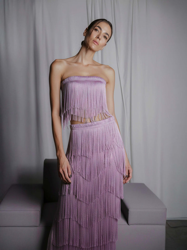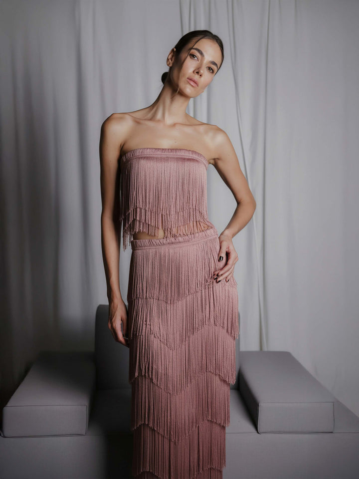 Strapless crop top featuring front fringes and a waistband adorned with matching tassels that enhance its design. This bold top adds a touch of movement and style to any outfit.