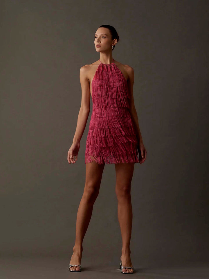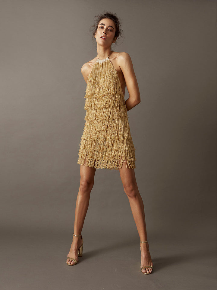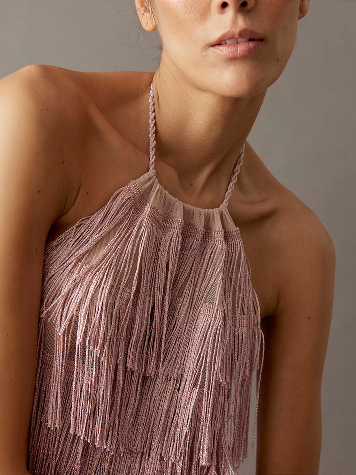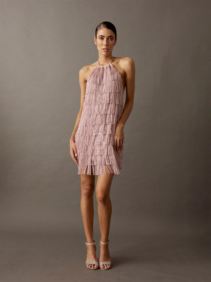 This dusty mini dress is a playful and graceful piece crafted with layered rows of fringes that move fluidly with every step. Featuring a sheer halter neckline that ties around the neck and leaves the back fully exposed, the silhouette balances sensuality and sophistication. The straight yet slightly shaped fit flatters the figure while offering freedom of movement, ideal for evening events or special occasions where artisanal detail and timeless design make the difference.
