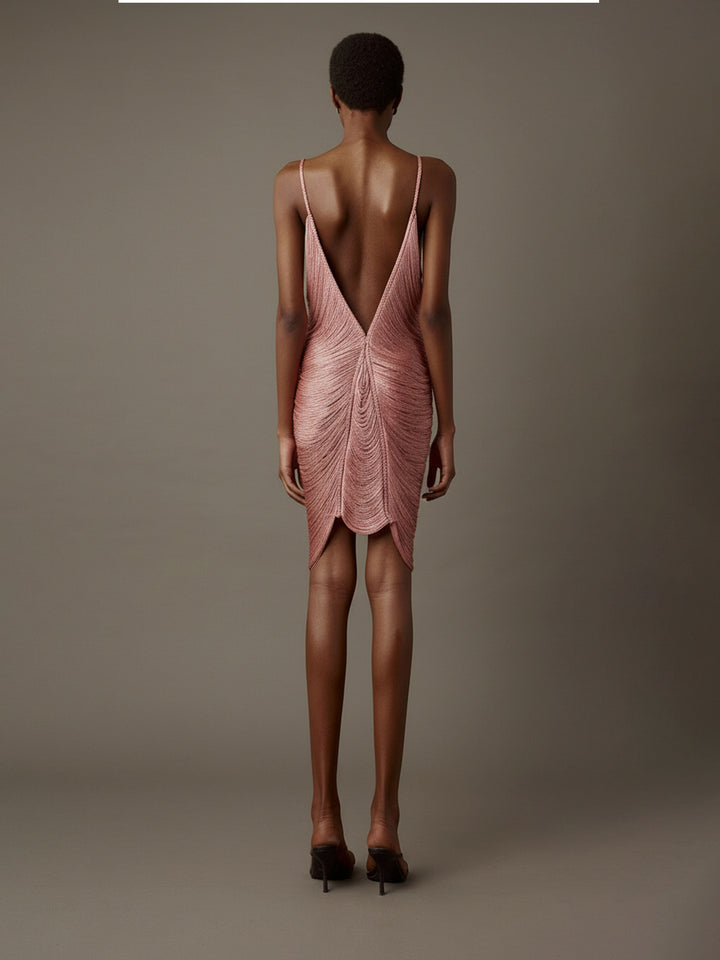 Esta pieza excepcional cuenta con un forro del mismo tono que los flecos, con propiedades elásticas que se adaptan a tu figura y una suavidad al tacto que te envuelve en comodidad y elegancia. El vestido Kaua es la elección perfecta para destacar en cualquier ocasión especial.