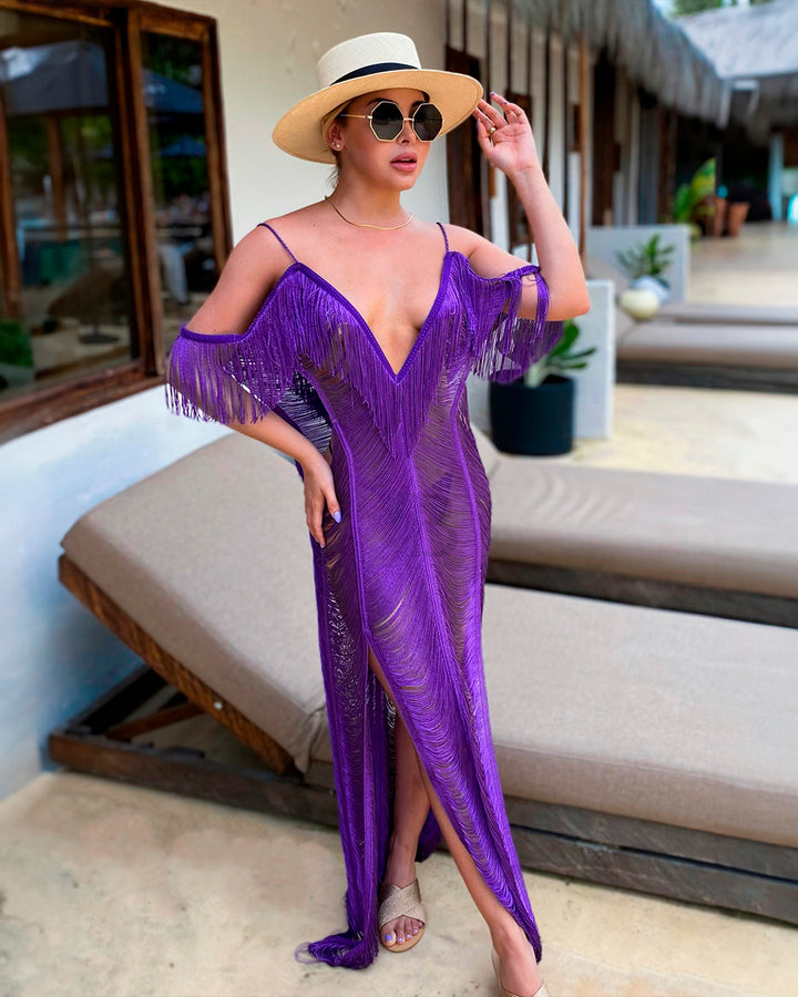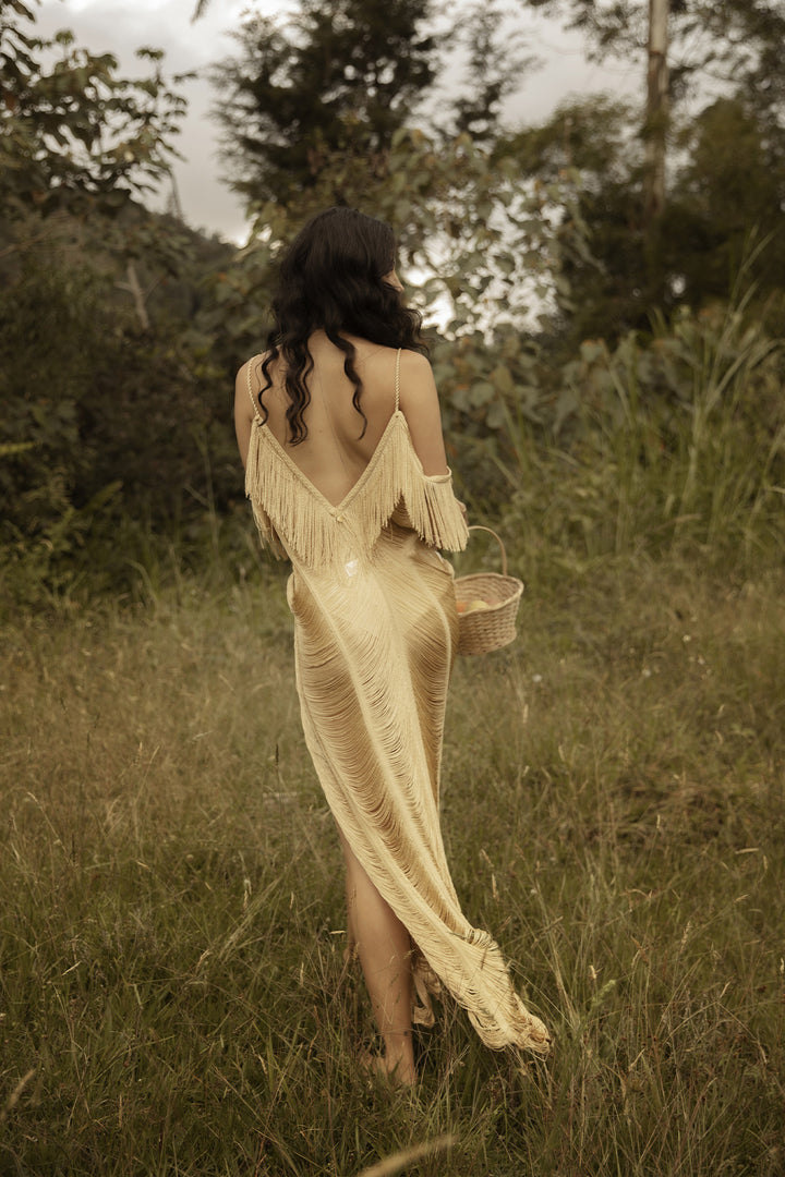 An ivory fringe dress crafted to sculpt the silhouette with subtle elegance. The plunging V-neckline and bare shoulders highlight a sensual yet effortless charm, while side slits bring fluidity and freedom to each step. Ideal for beach weddings, sunset celebrations, or any occasion where artisanal luxury becomes the statement.