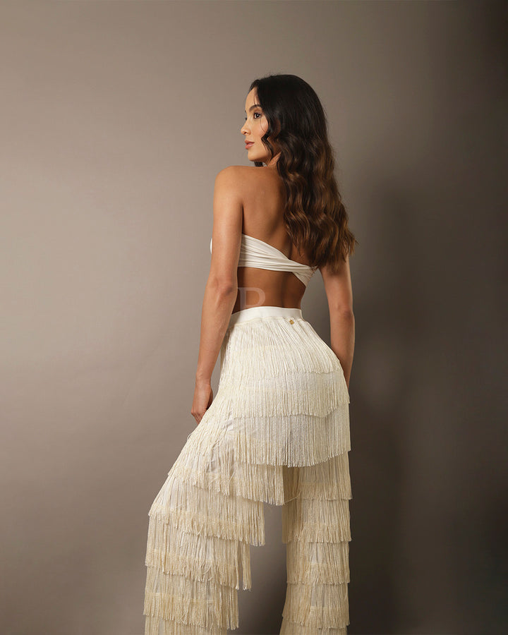 These black trousers elevate any look with a fluid silhouette and layered fringes that sway hypnotically with every step. Their graceful drape and artisanal texture make them a standout piece for special occasions or sophisticated evening looks. Perfect to pair with fitted tops or structured upper garments.