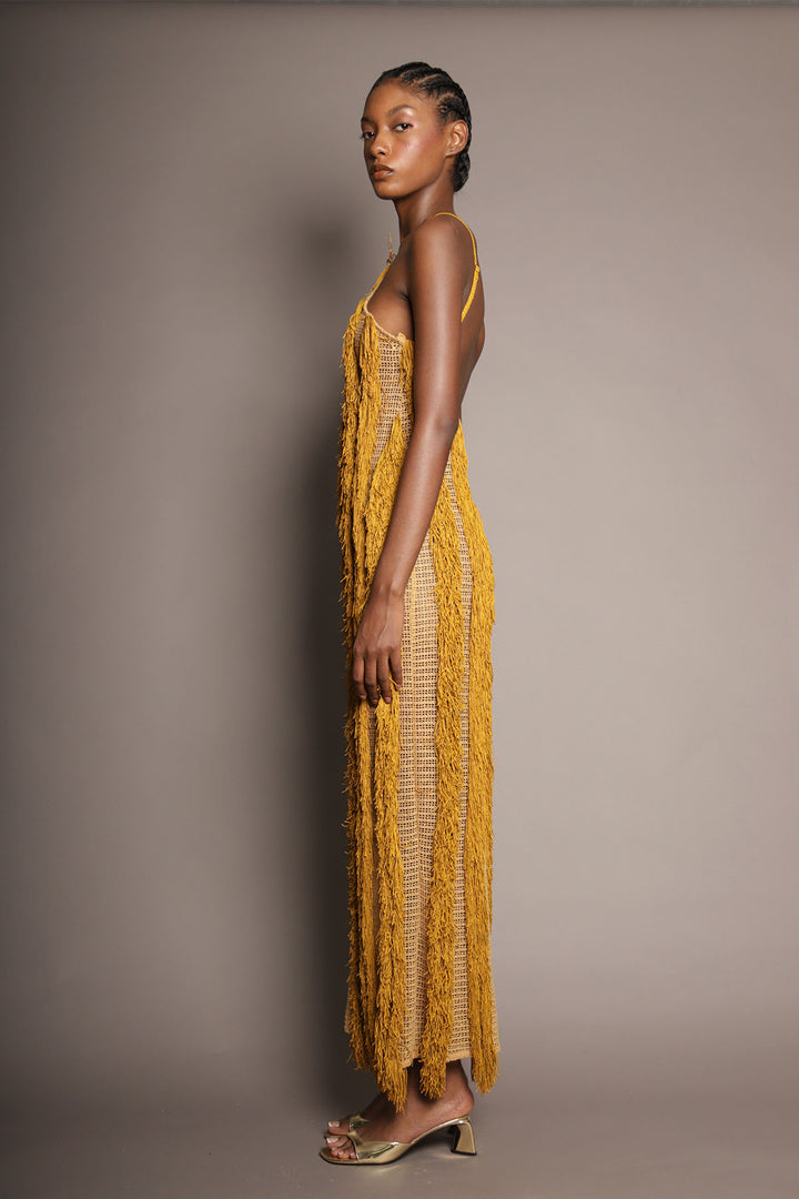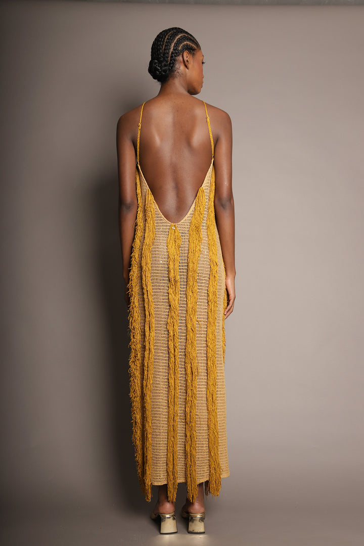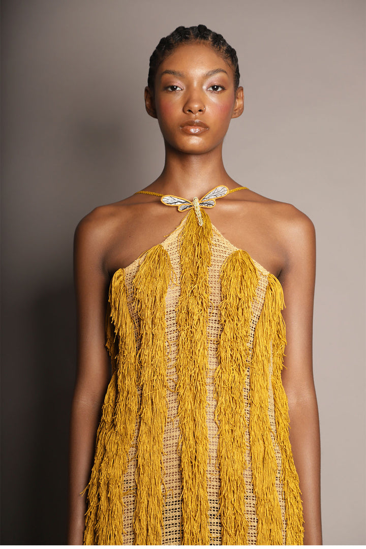 This mustard-toned dress captures the essence of artisanal luxury, flowing like a moving piece of art. Handwoven with vertical fringe accents, it elongates the silhouette with elegance and fluidity. The halter neckline, tied with an embroidered ribbon, adds a distinctive touch that enhances the feminine and unique nature of the piece. Perfect for day-to-night events where ethereal style meets sophistication.