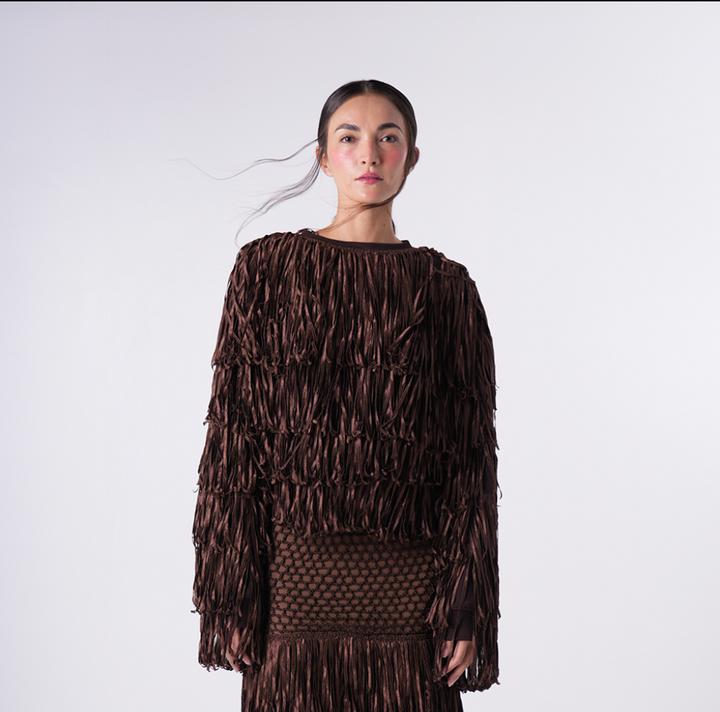 The Mocca Nest is a tactile embrace of cascading ribbon fringe, crafted in rich brown threads layered to sculpt an oversized silhouette. Its dense texture and fluid movement create a dramatic presence, ideal for pairing with pants or skirts.