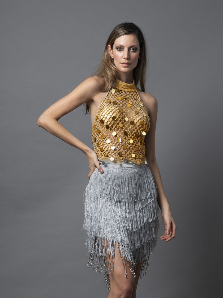 The Moneta Top embodies handcrafted sophistication through its intricate halter silhouette and openwork design. Handwoven with precision, it features delicate circular accents that capture light with effortless grace.