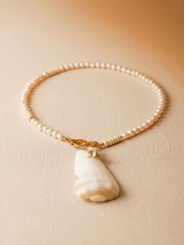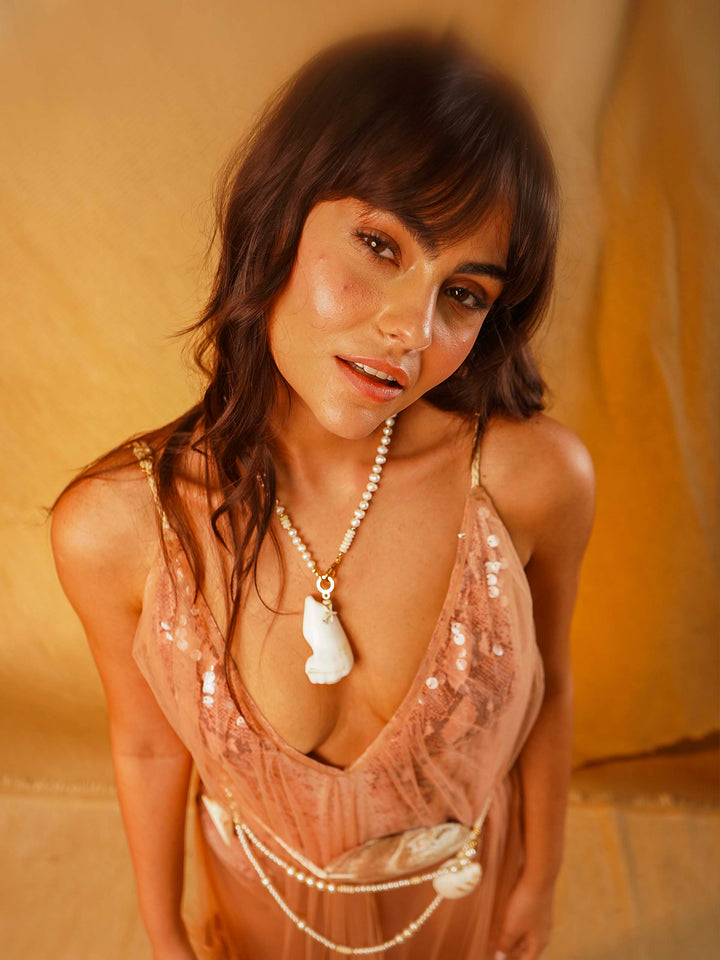 The Nakar Necklace is an artisanal piece that celebrates the strength of the sea through its unique design. Crafted with pearly beads and natural pearls, it interlaces into an organic finish that evokes ocean textures. At its center, a natural nacre pendant stands out, enhanced with golden details and subtle accents that bring sophistication and character.