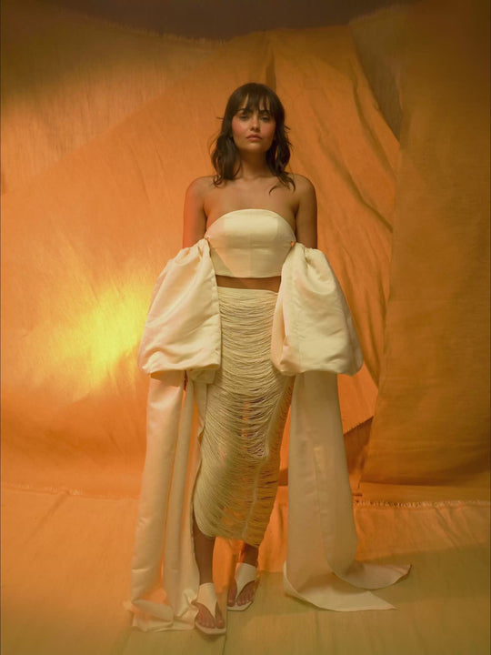 The Opalo Skirt is a true textile masterpiece, wrapping the silhouette with a hypnotic effect of interwoven fringes. Crafted in ivory threads with diagonal draping, it creates graceful movement that enhances femininity with every step. Its body-hugging cut is balanced by a back slit, offering both comfort and refinement. Designed to shine in luxurious settings, from exclusive dinners to moonlit celebrations.