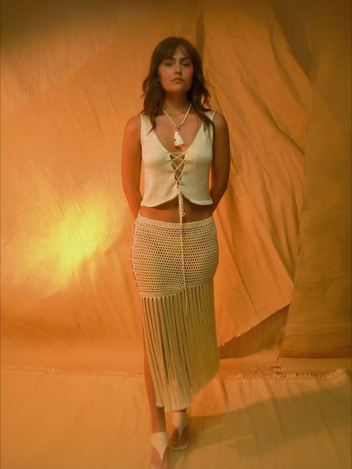 The Ostrea Skirt is an artisanal crochet piece that blends sensuality with elegance. Handcrafted with precision, its strategic transparencies and interlaced side details evoke the strength of the sea and the uniqueness of the woman who wears it. Long fringes cascade gracefully with every step, adding movement and sophistication. A skirt that merges artisanal tradition with a modern vision of luxury.