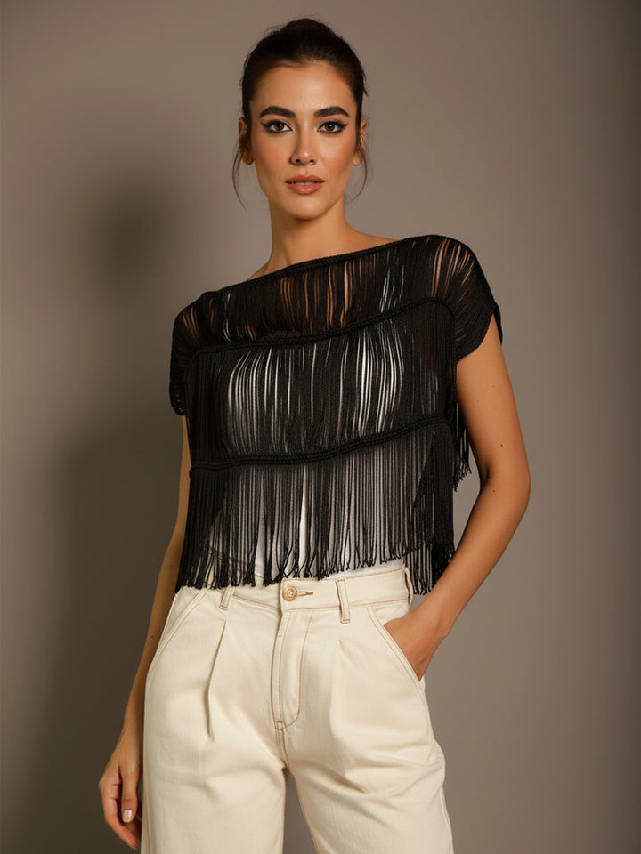 An ode to effortless elegance and fluid motion. This artisanal top features cascading layers of delicate handwoven fringes that flow with every movement, tracing the body in a dance of lightness and sophistication. The open-back silhouette and soft shoulders create a subtle sense of allure, blending structure and freedom in perfect harmony.