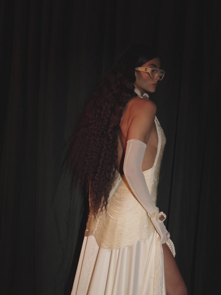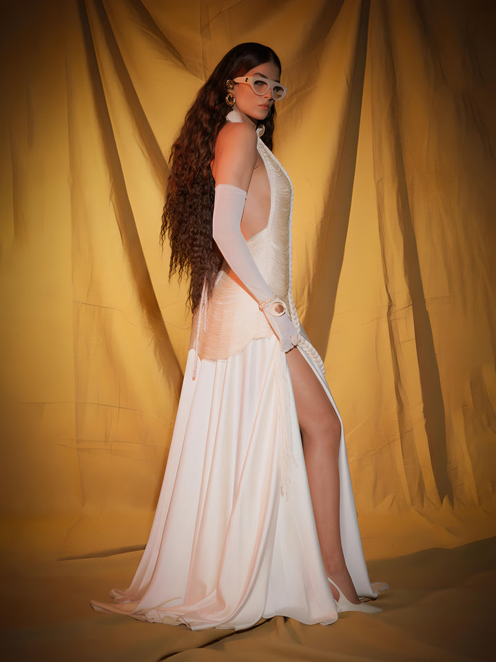 El vestido Jadeita captura la esencia de la elegancia etérea. Su corpiño halter, elaborado artesanalmente con hilos en cascada, enmarca la silueta con sensualidad y gracia. Con un fluido satén color marfil, la falda presenta una abertura central que le aporta movimiento y encanto. Los detalles trenzados realzan su carácter artesanal, mientras que la espalda abierta completa el look con un sutil toque dramático. Un vestido diseñado para galas, bodas o cualquier ocasión donde la sofisticación sea la protagonista.