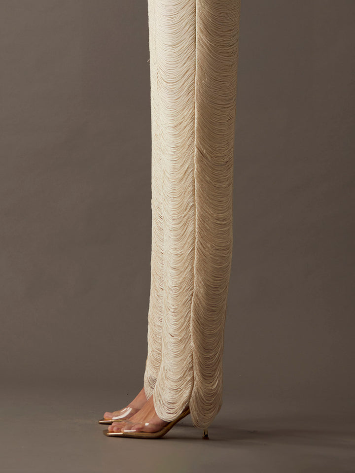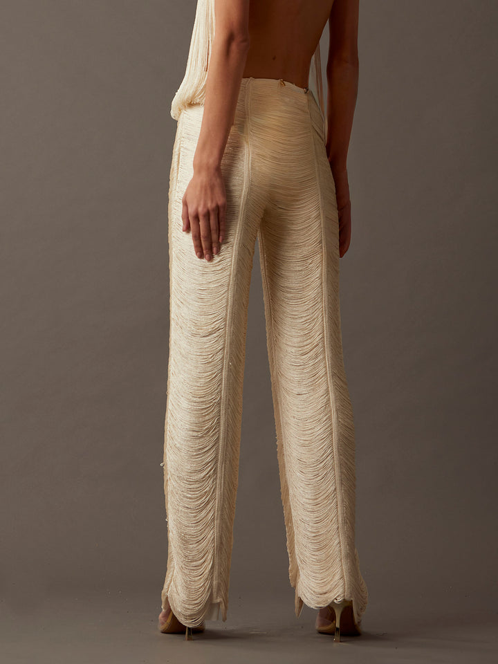 Estos pantalones de hilo fluido irradian sofisticación con su textura luminosa y silueta relajada. Una prenda versátil que realza cualquier look con una elegancia discreta.