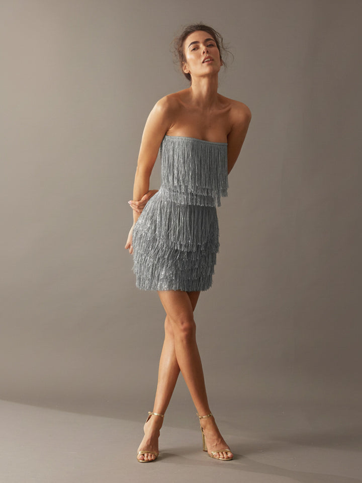 The Roxy Set embodies the art of motion through handcrafted layers of delicate fringe. Its strapless top flows effortlessly, designed to move in harmony with the body, while the matching skirt enhances the silhouette with cascading tiers that create a mesmerizing sense of rhythm.