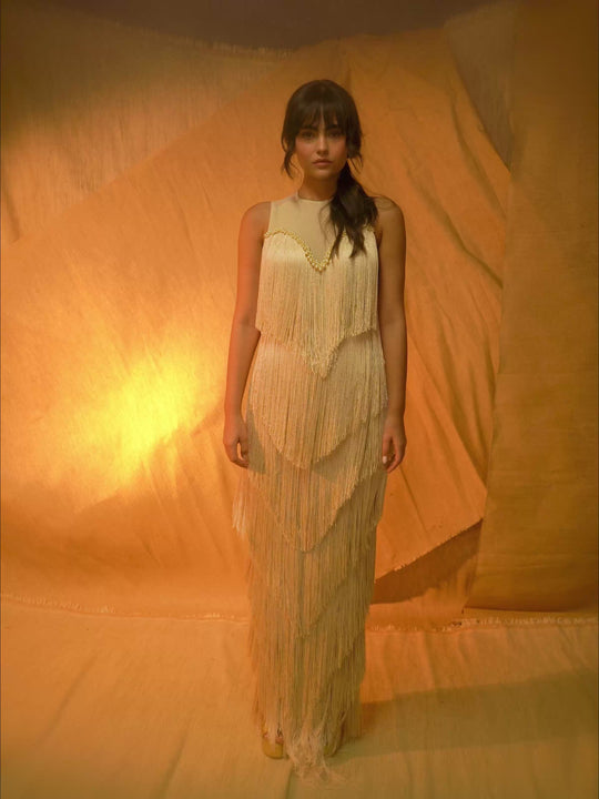 Esta pieza irradia elegancia con una silueta recta, elaborada con capas transparentes y flecos artesanales en cascada. Cada capa de flecos fluye con naturalidad, aportando movimiento y ligereza a la pieza. El escote, delicadamente adornado con bordados de perlas, añade un detalle lujoso y femenino, realzando los suaves tonos marfil que evocan serenidad y elegancia atemporal. Una creación refinada diseñada para celebrar la feminidad con gracia y sofisticación, perfecta para ocasiones de noche, eventos de lujo o entornos donde la artesanía se fusiona con el estilo contemporáneo.