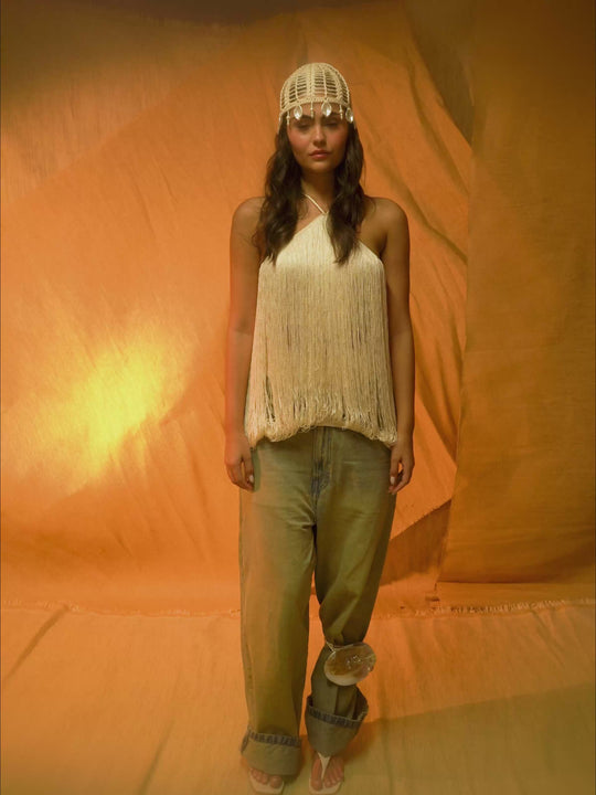 El top Dattora encarna la feminidad artesanal, tejido a mano con finos hilos y con flecos en cascada que fluyen desde su escote halter. Su silueta ligera y vaporosa favorece el movimiento, combinando elegancia con un toque bohemio. Diseñado en color marfil, es una prenda versátil que combina a la perfección con vaqueros para looks informales o realza conjuntos playeros para atardeceres en la playa y ocasiones especiales.