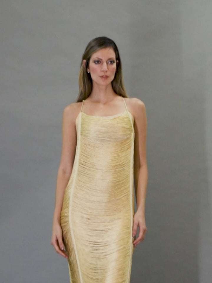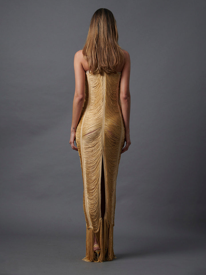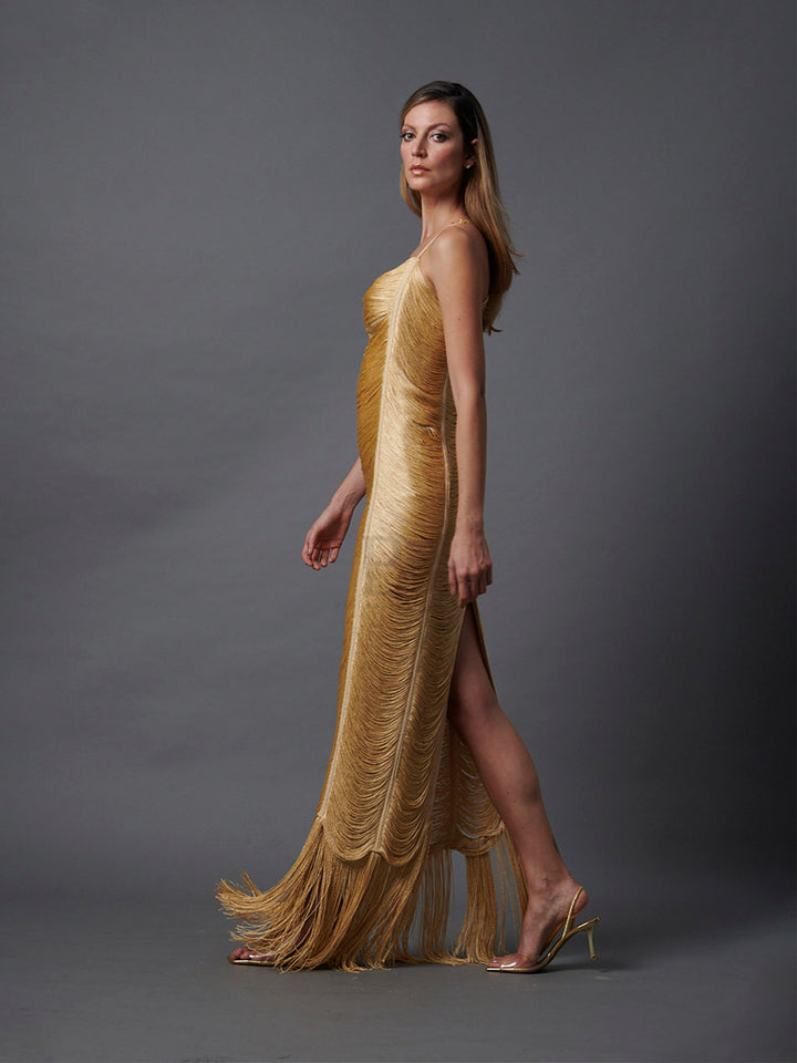 Una silueta que fluye como un collar de perlas. Este vestido dorado suave presenta una cascada vertical de delicados flecos y un sutil escote desbocado, sujeto por finos tirantes. La silueta se adapta suavemente al cuerpo, fluyendo hasta el suelo con flecos que se mueven con gracia. Una pieza elegante y sin esfuerzo, perfecta para celebraciones de lujo, veladas al atardecer o la elegancia junto al mar.