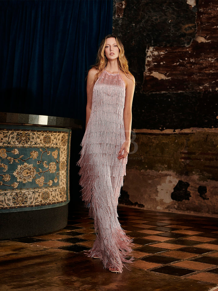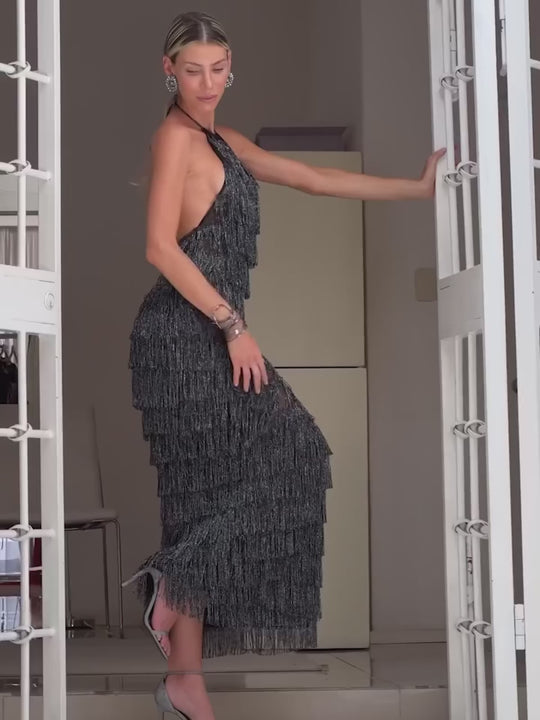 Vestido largo halter confeccionado con capas de flecos dorados en cascada que fluyen desde el escote hasta el bajo. Su silueta fluida y sus profundos cortes laterales revelan la espalda y los costados, combinando sensualidad y elegancia. Los flecos escalonados aportan volumen y un movimiento cautivador, convirtiendo este vestido en una pieza artesanal excepcional para cualquier ocasión especial.