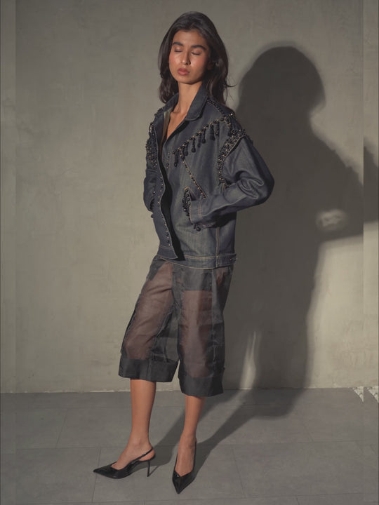 Intervenida manualmente con aplicaciones de pedrería y detalles en cascada que aportan textura, brillo sutil y movimiento, elevando la prenda hacia una pieza única de carácter artesanal.