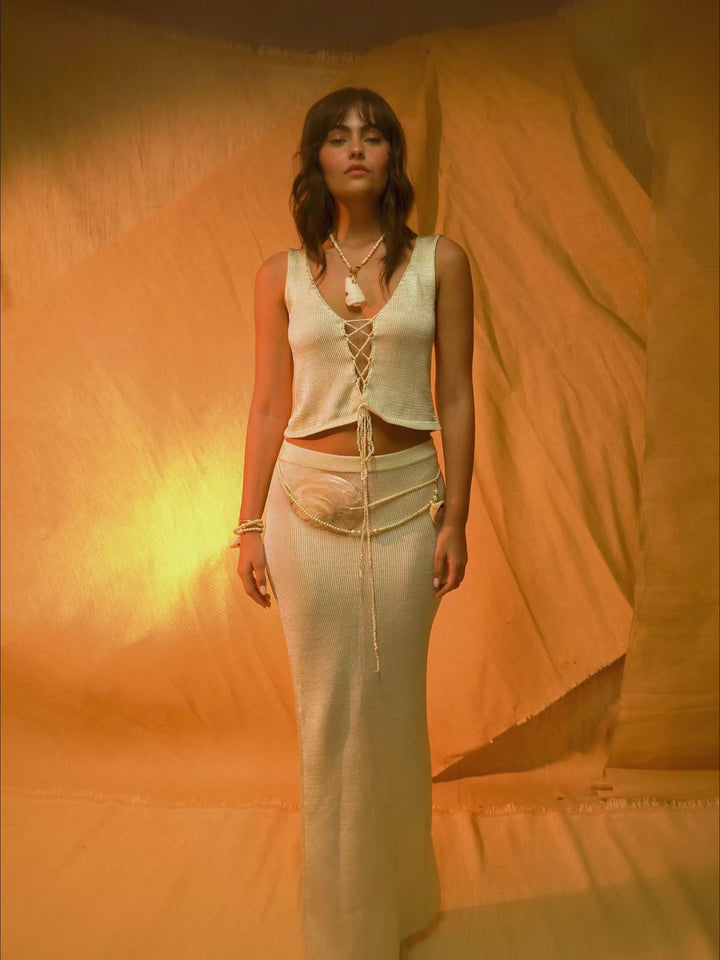 The Calma Top embodies simplicity and balance in a light, effortless silhouette. Crafted in an ivory tone, it features a delicate front lace-up closure that enhances its sensual yet relaxed character. A versatile artisanal piece, perfect to pair with fringe skirts or wide-leg pants for daytime elegance or sunset gatherings.