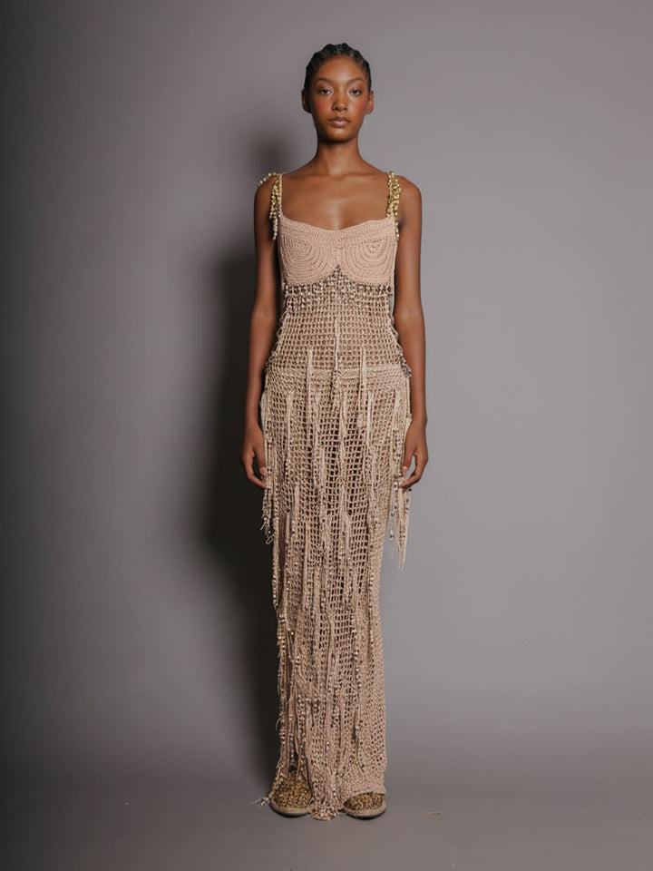 Crochet dress embellished with hand-embroidered bugle beads in stones. Its fitted silhouette enhances the figure, while the intricate crochet work highlights and accentuates the bust.