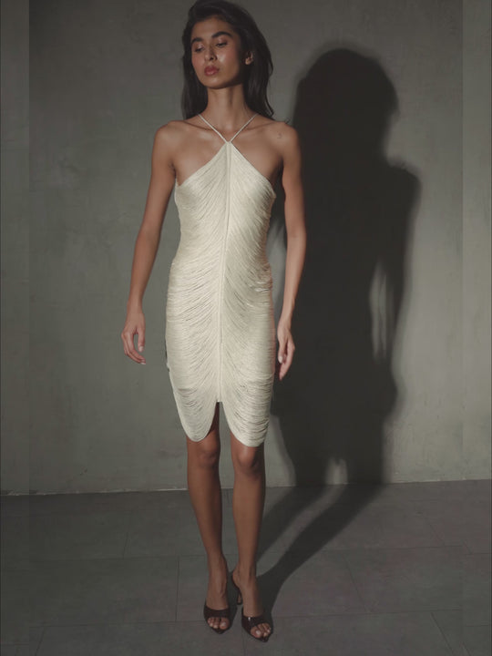 Designed for a fitted silhouette that enhances your figure. The exquisite halter neckline is held in place by our handcrafted braiding, adding a touch of distinction to your style. Easy to wear thanks to a zipper at the center back that joins with a plunging V-neckline, creating a perfect balance between sensuality and sophistication.