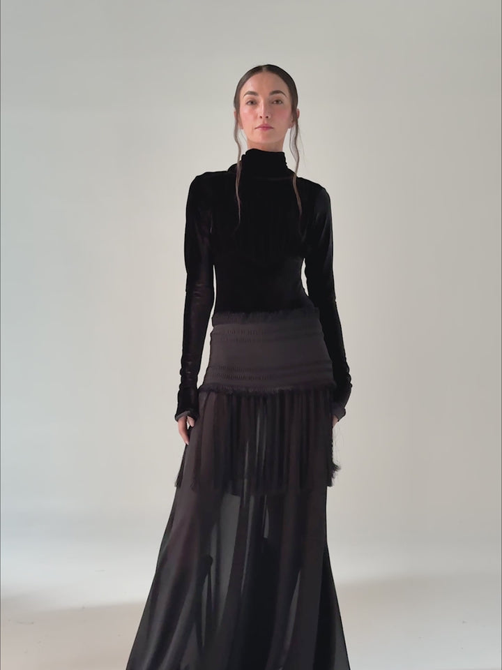 The Racine Skirt is a full-length piece that merges artisanal texture with fluid elegance. Its handwoven waistband defines the silhouette, while layered black fringes over a translucent base add dramatic depth and graceful movement.