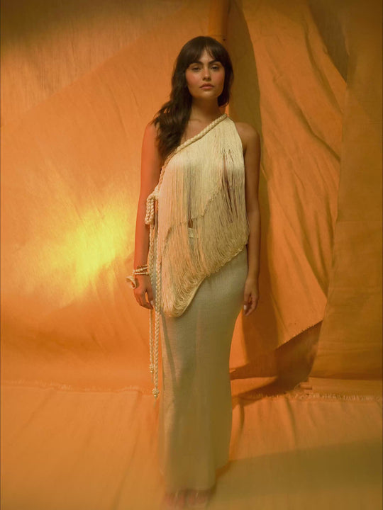 The Soral Top is an asymmetrical masterpiece that blends sensuality with strength in every detail. Crafted from artisanal silk threads that cascade into long, fluid fringes, it embraces the body with a sophisticated one-shoulder silhouette. The hand-braided side tie adds an organic and versatile touch, while the flowing fringes bring a sense of movement and freedom, evoking ethereal elegance. Perfect for special occasions where a bold and unique look is essential.